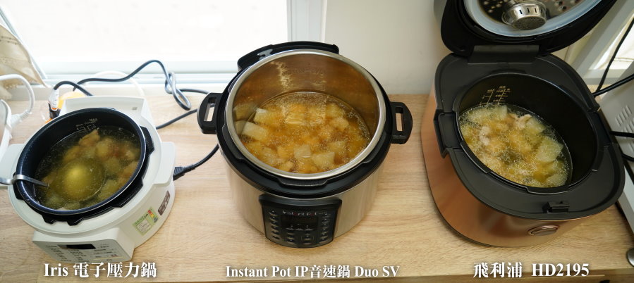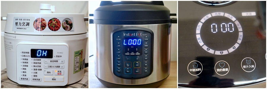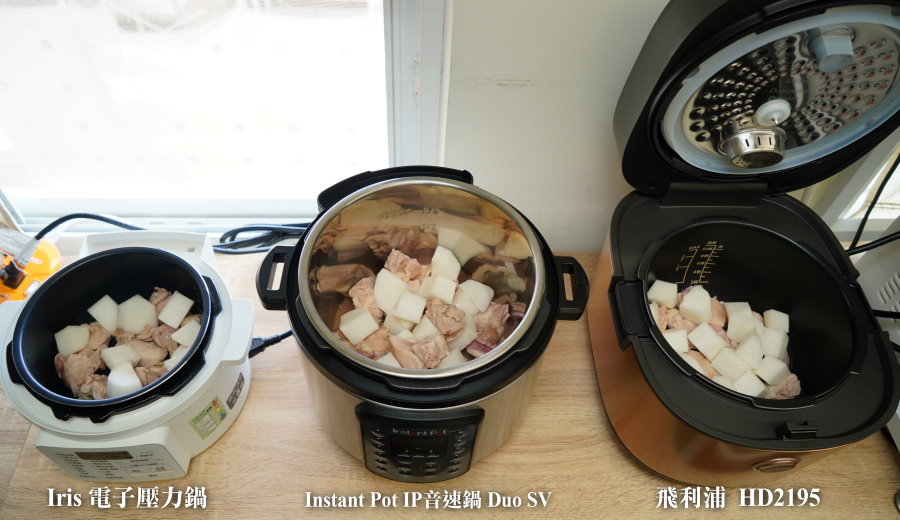 ▼這次要評比的就是這三款超熱銷的壓力鍋,由左而右分別是Iris PC-MA2-W(下面簡稱Iris電子壓力鍋)、Instant Pot IP音速鍋 Duo SV(下面簡稱IP音速鍋)、飛利浦HD2195(下面簡稱金小萬),從價位、容量、外觀、功能、安全、清洗方便度、料理成果等各方面來做一個PK比較!