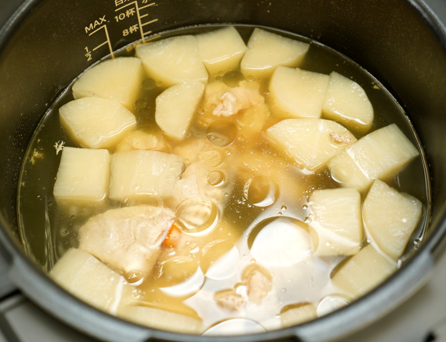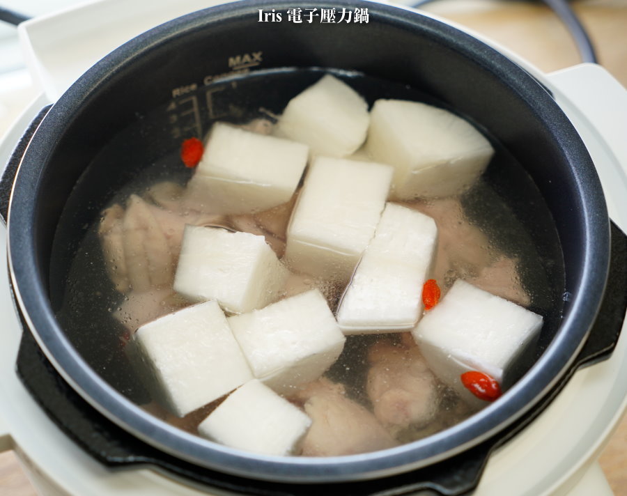 ▼登愣~蘿蔔雞湯完成啦!Iris電子壓力鍋煮出來的雞湯也很不錯,雖然容量小,但還是比用明火瓦斯煮還要方便,蘿蔔也煮得很透的感覺! (值得一提的,還沒到MAX線的湯量,其實鍋蓋就會沾到一些湯品的渣渣囉! )