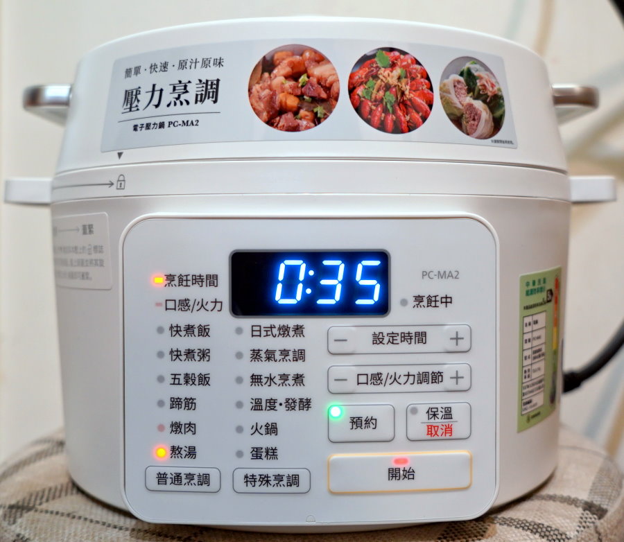 ▼開始要來烹煮啦!Iris電子壓力鍋設定的是熬湯模式,螢幕秀出的時間為35分鐘,是三台裡頭時間最長的,但這還不包括升壓、洩壓的時間~