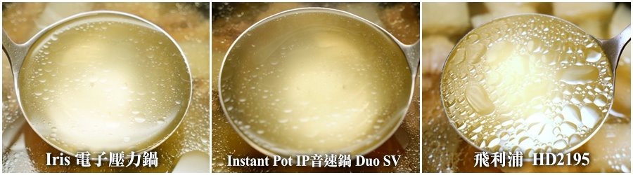 ▼湯頭看起來也沒有太大的差別,不過Iris電子壓力鍋喝起來相較之下比較清淡一些,IP音速鍋跟金小萬都滿清甜的,硬要比較的話金小萬的味道略為明顯,大概是93跟95分的差距,不過因為是燉煮蘿蔔雞湯的關係,差別不是很明顯,但如果是老火湯的話,感覺金小萬更能把營養、味道都燉煮出來,所需時間也較短,這樣來比較的話金小萬還是略勝一籌!