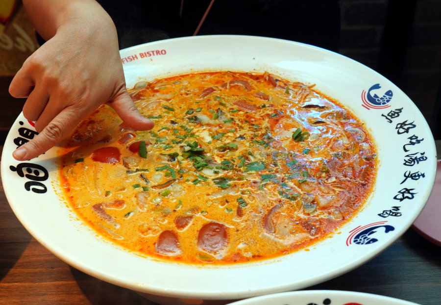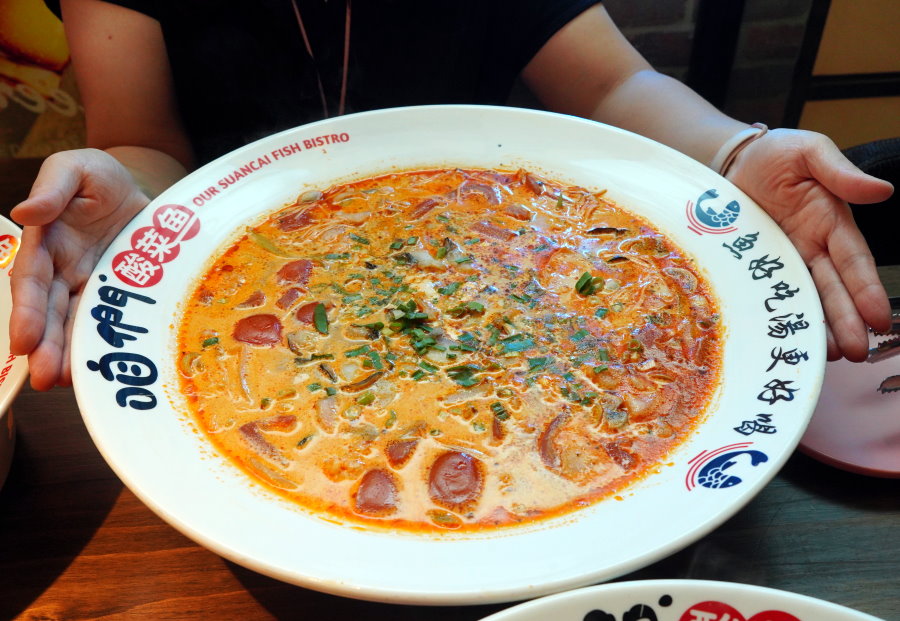 ▼用口咩當比例尺就知道他們家酸菜魚的尺寸有多巨大了~~每一盆都媲美臉盆大小,甚至還有比臉盆還大的尺寸,不怕吃不夠,只怕吃不下(笑)!