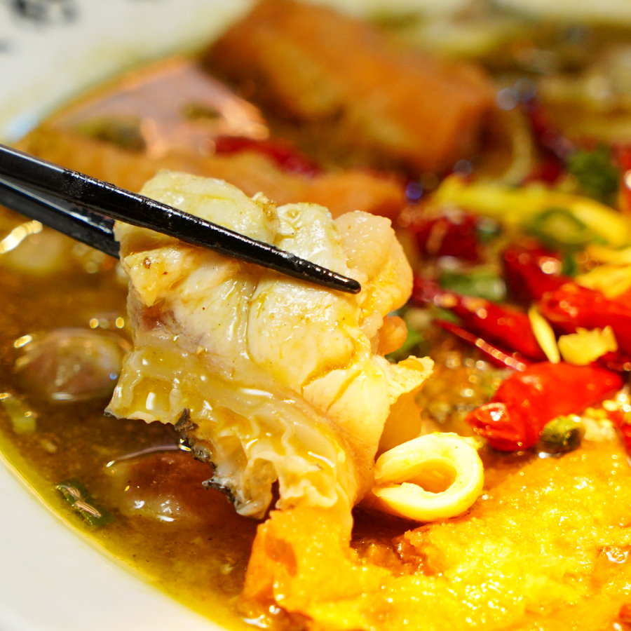 ▼招牌川味老罈酸菜搭配的是龍膽石斑,額外又加點了老油條、鴨肉丸,整體看起來更豐富了!