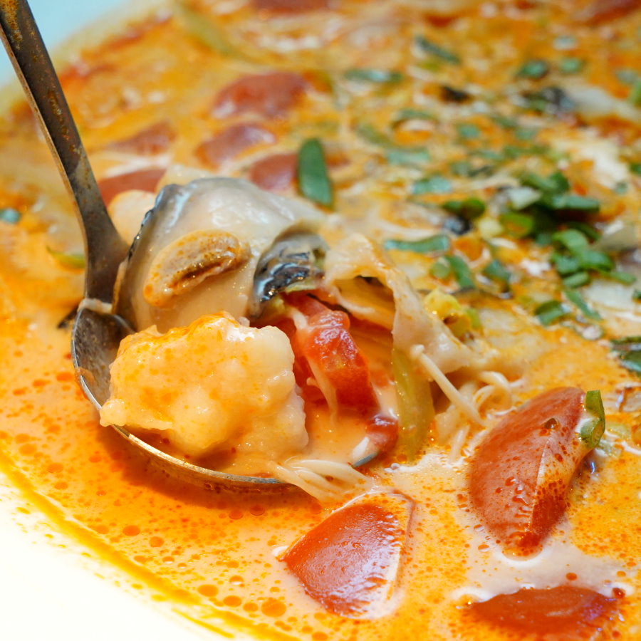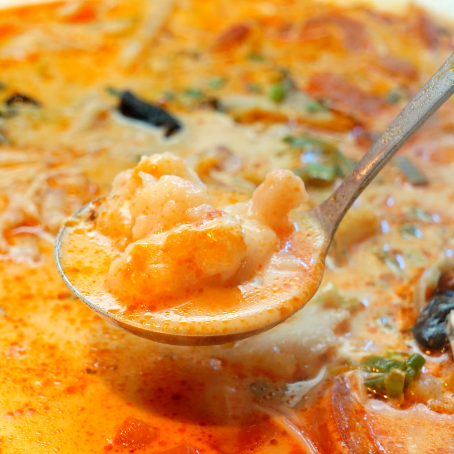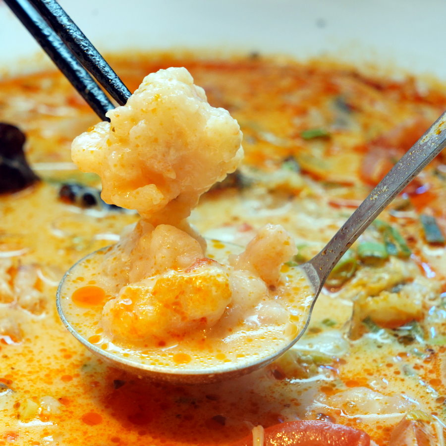 ▼貴妃蝦滑鮮美又脆彈,還帶有蝦仁顆粒與魷魚塊,搭配番茄奶香湯頭很合拍,推薦必點。