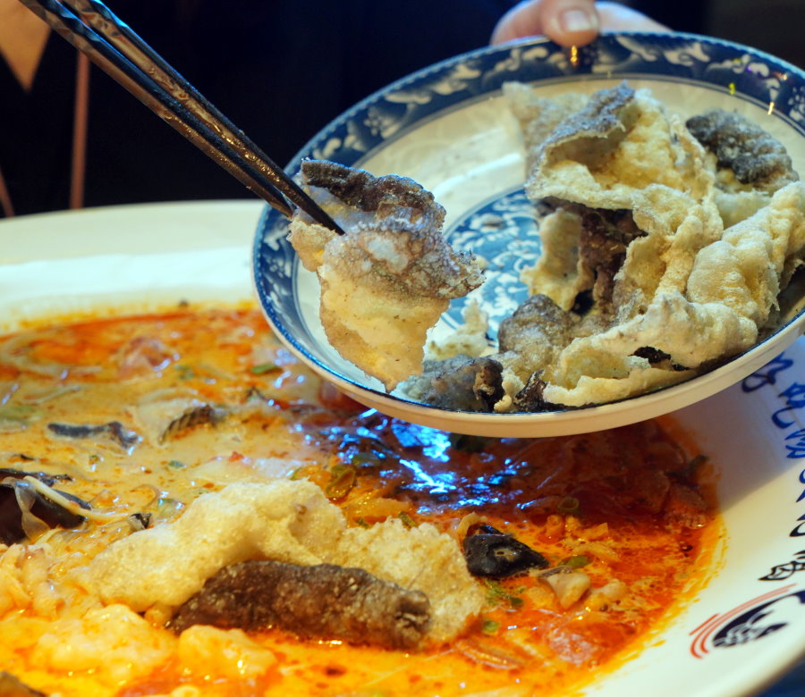 ▼炸至香酥的魚皮放進湯頭裡烹煮一分鐘就能享用囉~~