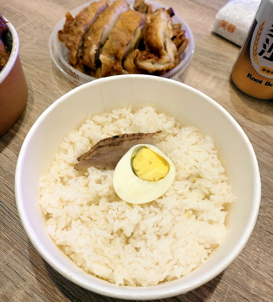 ▼下方白飯也附有半顆水煮蛋及鹹豬肉。