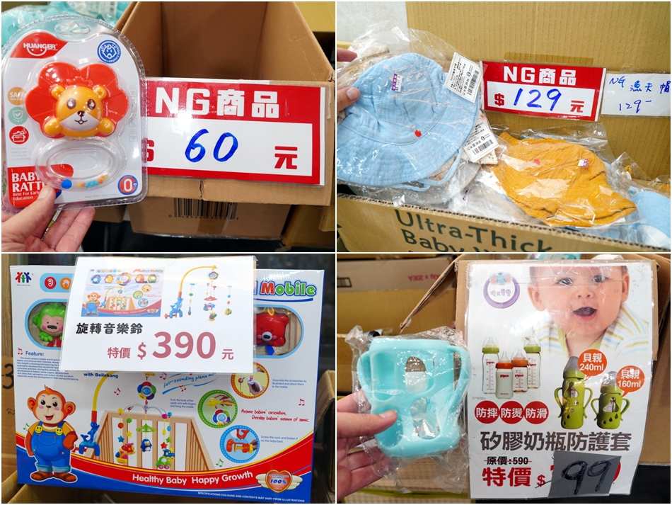 ▼固齒器原價99元,NG價只要60元很超值;嬰兒床音樂鈴特價只要390元,現省200元很可以。另外還有漁夫帽、奶瓶防護套都有NG價,記得先確認沒問題再結帳。