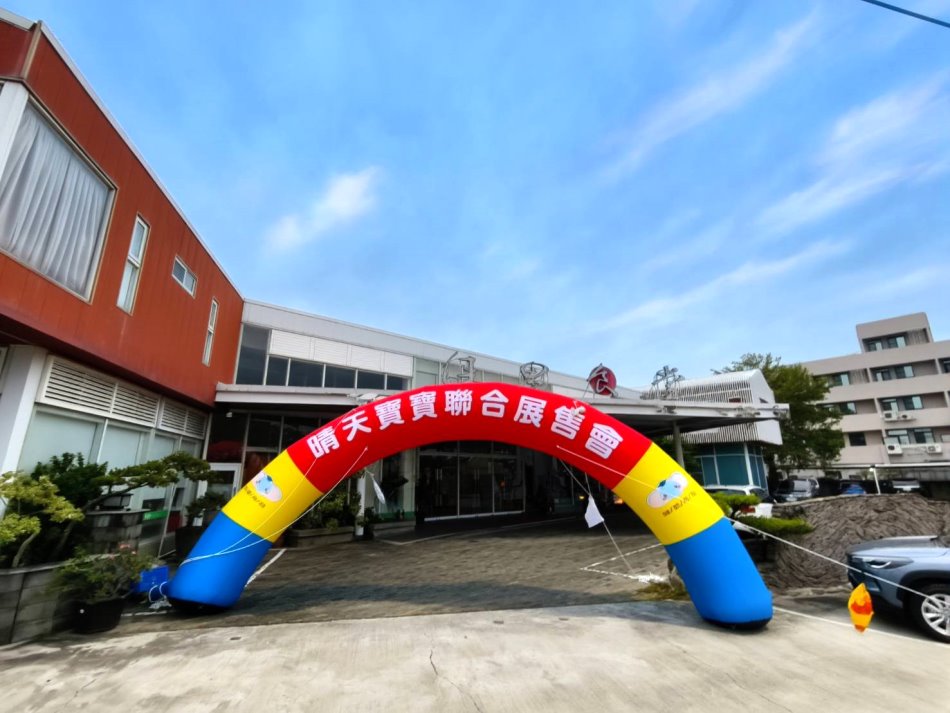 ▼「晴天寶寶婦嬰用品聯合特賣會」就位於台南市佳里區忠孝東路上、佳里食堂裡頭,前方擺放大型氣球城堡跟立旗,看到就代表特賣會到囉!