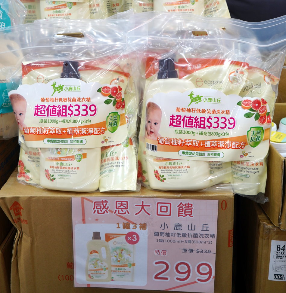 ▼小鹿山丘葡萄柚籽低敏抗菌洗衣精整套只要299元(本場限定),裡頭有瓶裝x1+補充包x3,拿起來非常有重量,原價可是要339元,現買現省超划算。