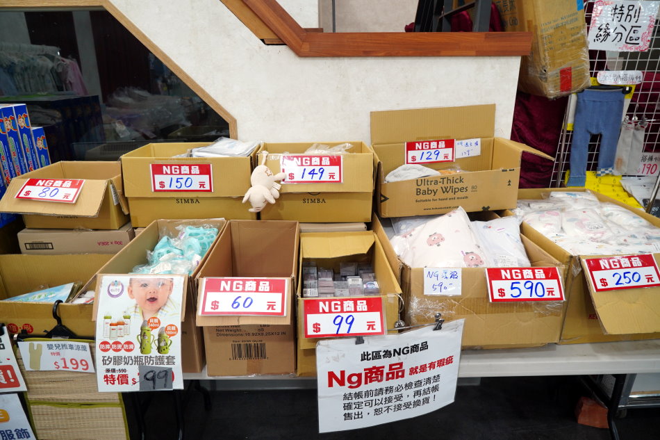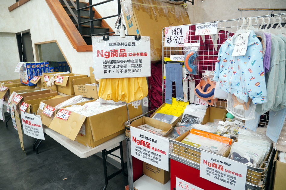 ▼NG商品區,很多商品都是有點小瑕疵或是線頭、髒污等,但不影響使用,結帳前一定要檢查清楚,確認可以接受再購買唷!