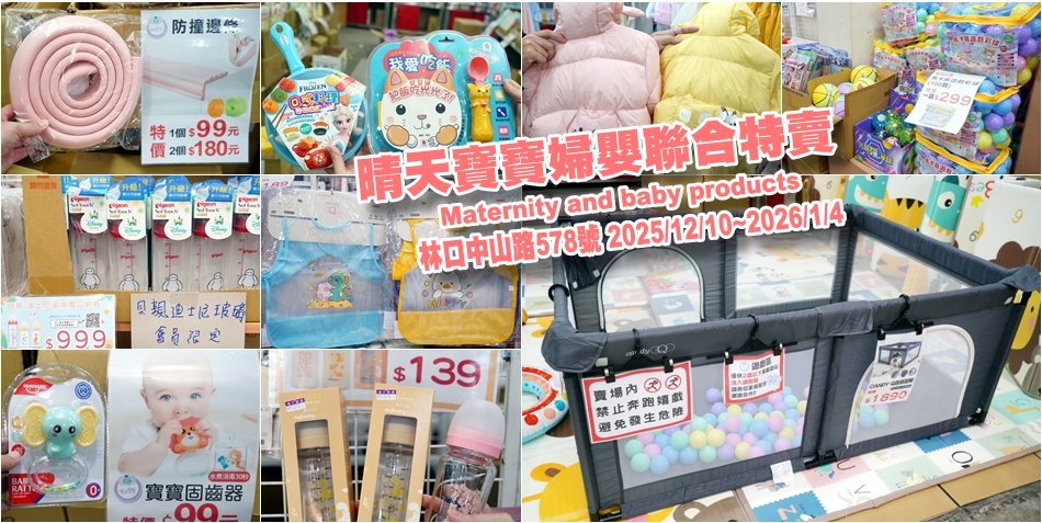 人客啊~~這麼好康的事不分享不行!!婦嬰用品、品牌牛仔褲、精品寢具、奇威女裝通通俗給你~~晴天寶寶婦嬰用品聯合特賣會來到新北林口中山路上,活動日期自2025/12/10~2026/1/4,路邊車格方便又好停!晴天寶寶購物攻略幫大家整理好了,攜帶媽媽手冊並加入APP會員,就能用超值加購價買肚圍99元(厚款、薄款通通有),小獅王頂級奶瓶、小獅王消毒鍋、新款學習褲也有會員專屬優惠!獨家優惠小鹿山丘葡萄柚籽低敏抗菌洗衣精只要299元(一瓶+3包)、酷咕鴨抗菌洗衣精3入389元、媽咪小站寬口玻璃奶瓶139元、貝親奶瓶獨家任選3個999元,真的是非常划算!換季重點就是寶寶保暖衣物,童裝99元、兩件式套裝129元,MIT長褲50元、防踢被190元、長袖鋪棉套裝129元、保暖外套129元,台灣製穿起來更安心!另外還有85%羽絨外套790元,鋪棉外套、防寒背心、長袍、斗篷通通有,來一趟就能一次買齊!超值區也非常好買,防水圍兜兜99元、純棉口水巾2條150元,寶寶必備品趁優惠可以囤一波~~NG品出清區只有小瑕疵不妨礙使用,防撞邊條、丹麥奶嘴等通通便宜賣,簡便型背巾只要99元有夠佛心,有需求的朋友記得來挖寶!外出旅遊必備的奶粉袋、母乳袋、睡袋、乾濕兩用巾、兒童繪本、玩具、防蚊用品、推車等應有盡有~另外還有紡織品、圍欄、加厚地墊、背巾都是明星商品,特地來一趟都值得!逛完婦嬰用品還有大列車牛仔褲399元,另外還有大尺碼專區很友善;精品寢具枕頭買一送一990元,台灣製造澳洲混羊毛被只要1280元,現買現蓋剛剛好~奇威名品更是直接下殺2.5折,買起來高貴不貴很可以啊!