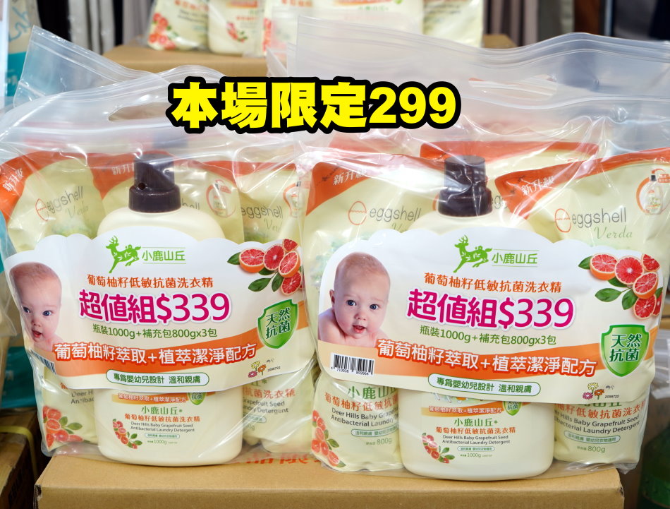 ▼小鹿山丘葡萄柚籽低敏抗菌洗衣精整套只要299元(本場限定),裡頭有瓶裝x1+補充包x3,拿起來非常有重量,原價可是要339元,現買現省超划算。