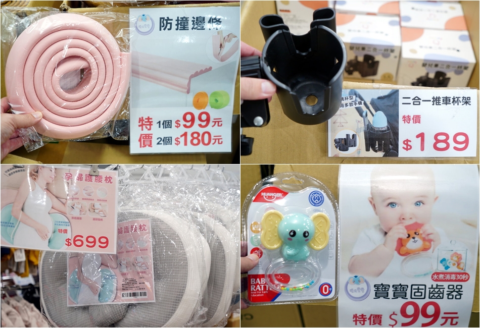 ▼防撞邊條也是有小朋友的家庭必備,就能防止小朋友跑跳時不小心受傷;推車杯架、蚊帳、雨衣等推車配件也能一次買齊。新推出的孕婦護腰枕也很實用,每個只要699元,可以當作靠枕腰墊或是腿部靠墊,讓孕媽咪可以適時舒緩一下。固齒器也是方便又好用,水煮消毒30秒即可,很適合長牙期使用。