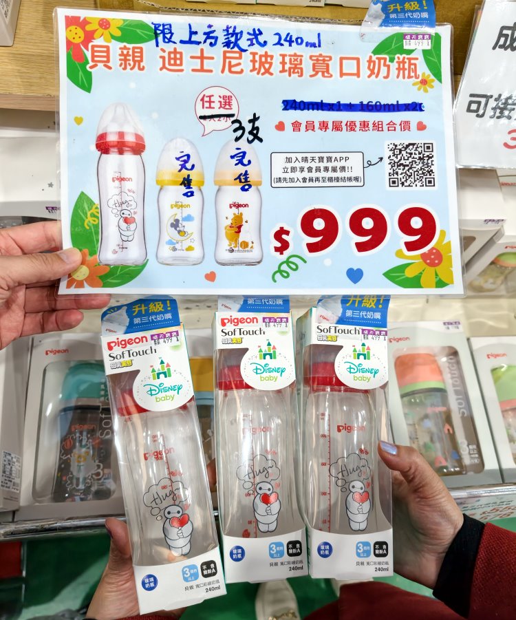 ▼貝親迪士尼玻璃寬口奶瓶獨家優惠,只要加入晴天寶寶APP會員就能享專屬折扣,任選3支只要999元,真的很超值啊!(每人限購一次)