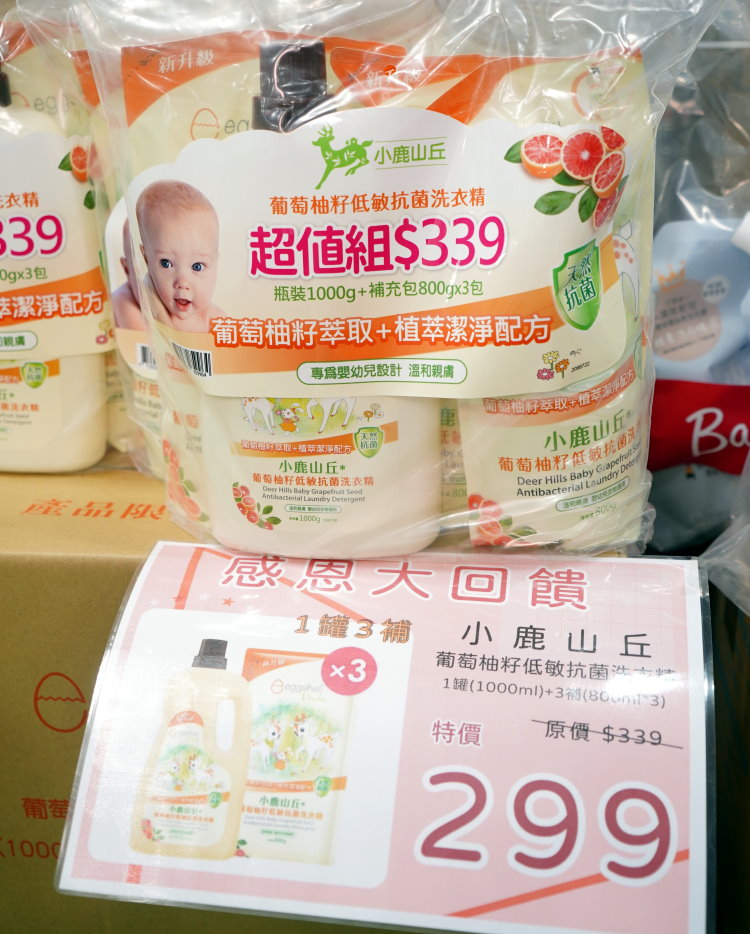 ▼小鹿山丘葡萄柚籽低敏抗菌洗衣精整套只要299元(本場限定),裡頭有瓶裝x1+補充包x3,拿起來非常有重量,原價可是要339元,現買現省超划算。