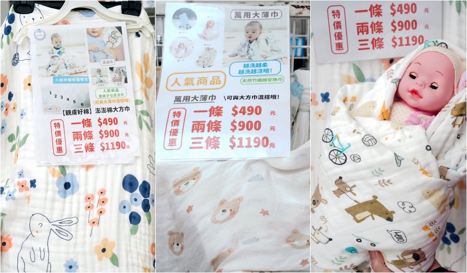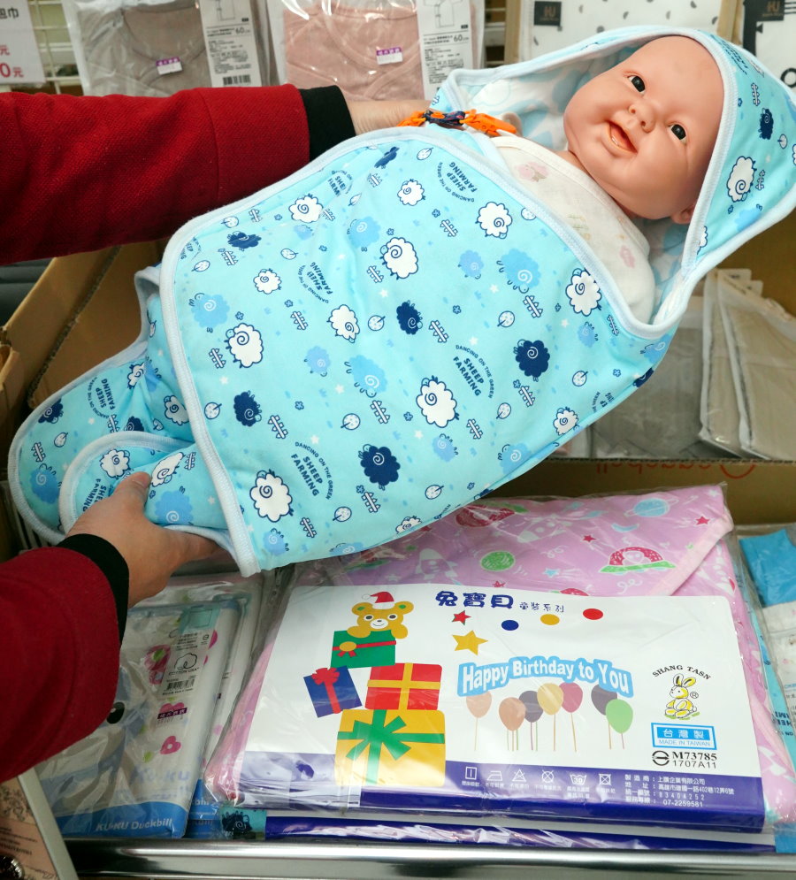▼嬰兒抱巾從頭到腳包緊緊,方便又保暖,現場還有三種顏色可選,每條只要290元很可以。