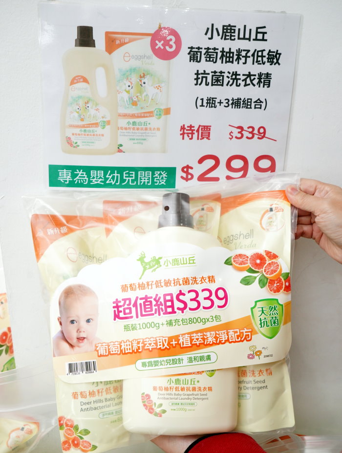 ▼小鹿山丘葡萄柚籽低敏抗菌洗衣精整套只要299元(本場限定),裡頭有瓶裝x1+補充包x3,拿起來非常有重量,原價可是要339元,現買現省超划算。