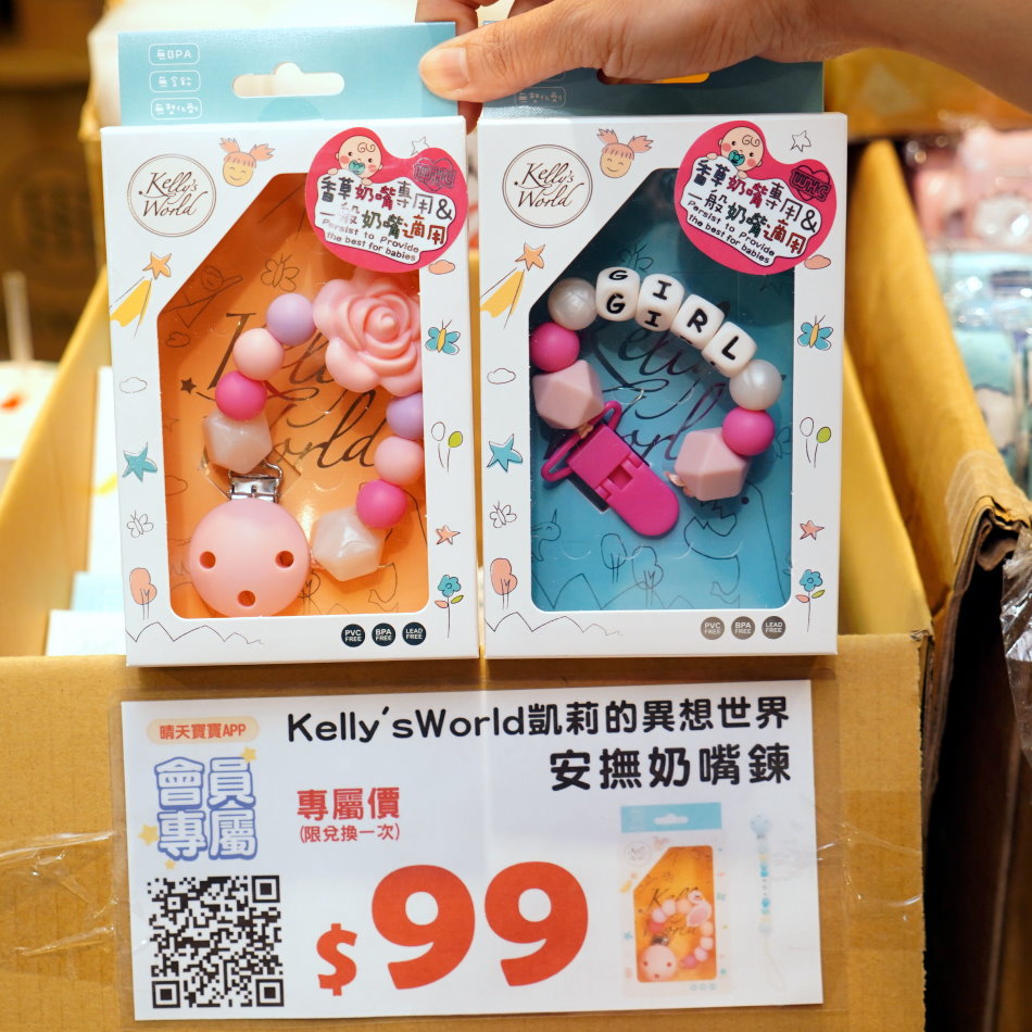 ▼安撫奶嘴鍊也太華麗了,不管是香草奶嘴或一般奶嘴都能使用,掛上去根本吊飾超可愛,會員專屬價只要99元。