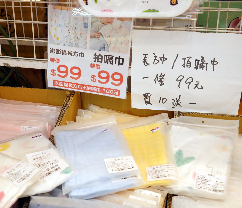 ▼很常換洗的拍嗝巾、長方巾一條99元,通通買10送1,還有組合價180元優惠。