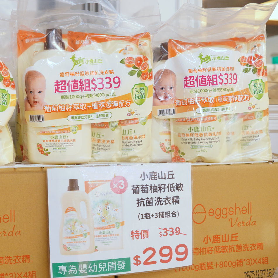 ▼小鹿山丘葡萄柚籽低敏抗菌洗衣精整套只要299元(本場限定),裡頭有瓶裝x1+補充包x3,拿起來非常有重量,原價可是要339元,現買現省超划算。