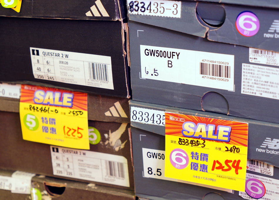 ▼鞋盒旁也有清楚的標示折數或價格,最低5折起出清價真的超瘋狂,不確定的話拿去櫃檯刷條碼就對啦!