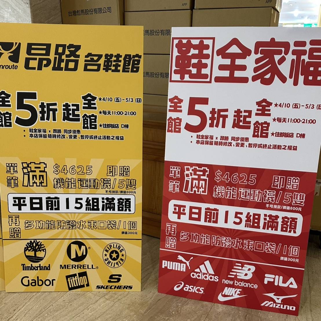 ▼鞋全家福x昂路名鞋館過季出清特賣會全館5折起,當筆消費滿4625元即送5雙機能襪(隨機贈送),平日前15組再加送多功能束口袋1個,有興趣的朋友記得要來要快!這裡需自備購物袋、穿著襪子試穿,另外因為這裡是鞋全家福、昂路名鞋館的最後出清特賣會,所以不能退換貨,大家記得檢查確認清楚再結帳。