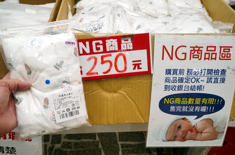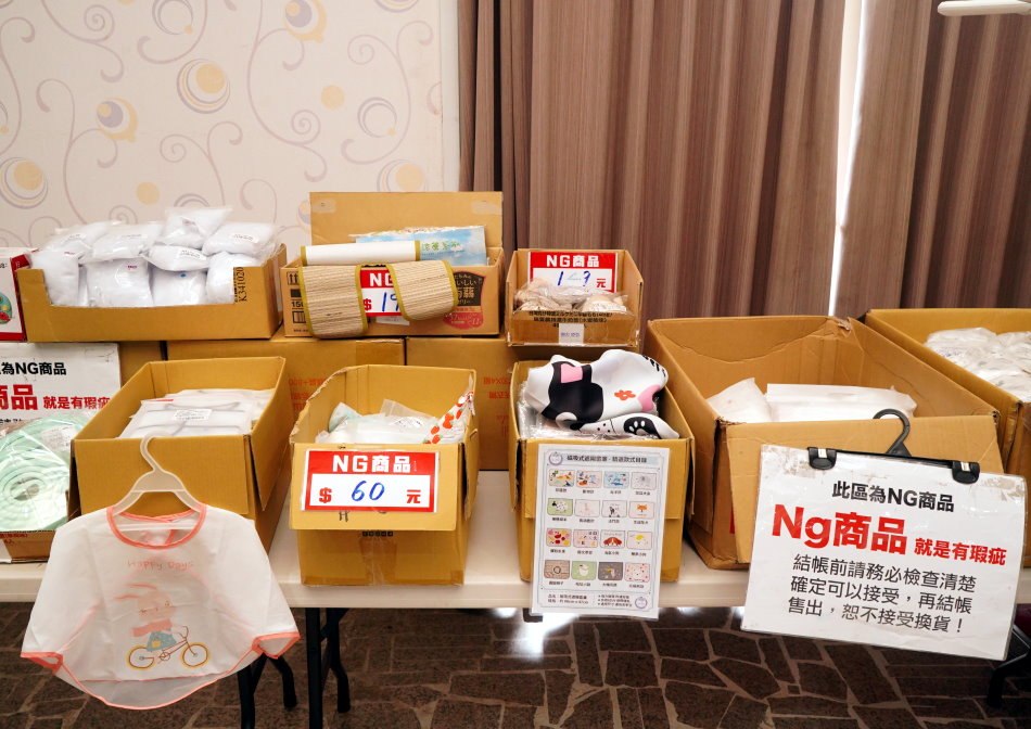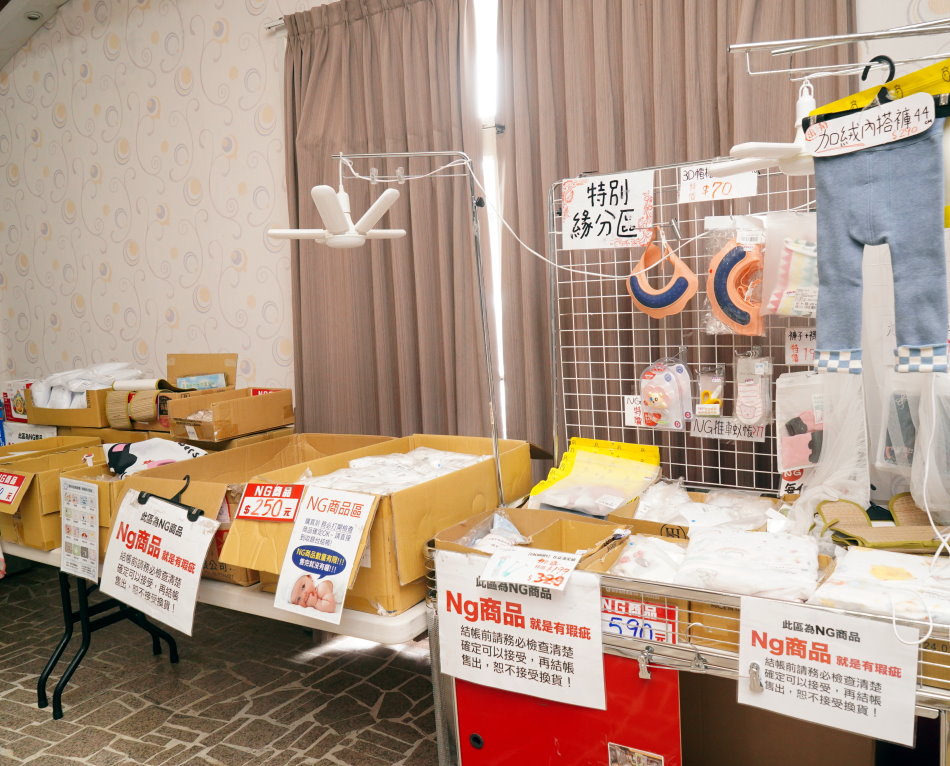 ▼NG商品區,很多商品都是有點小瑕疵或是線頭、髒污等,但不影響使用,結帳前一定要檢查清楚,確認可以接受再購買唷!