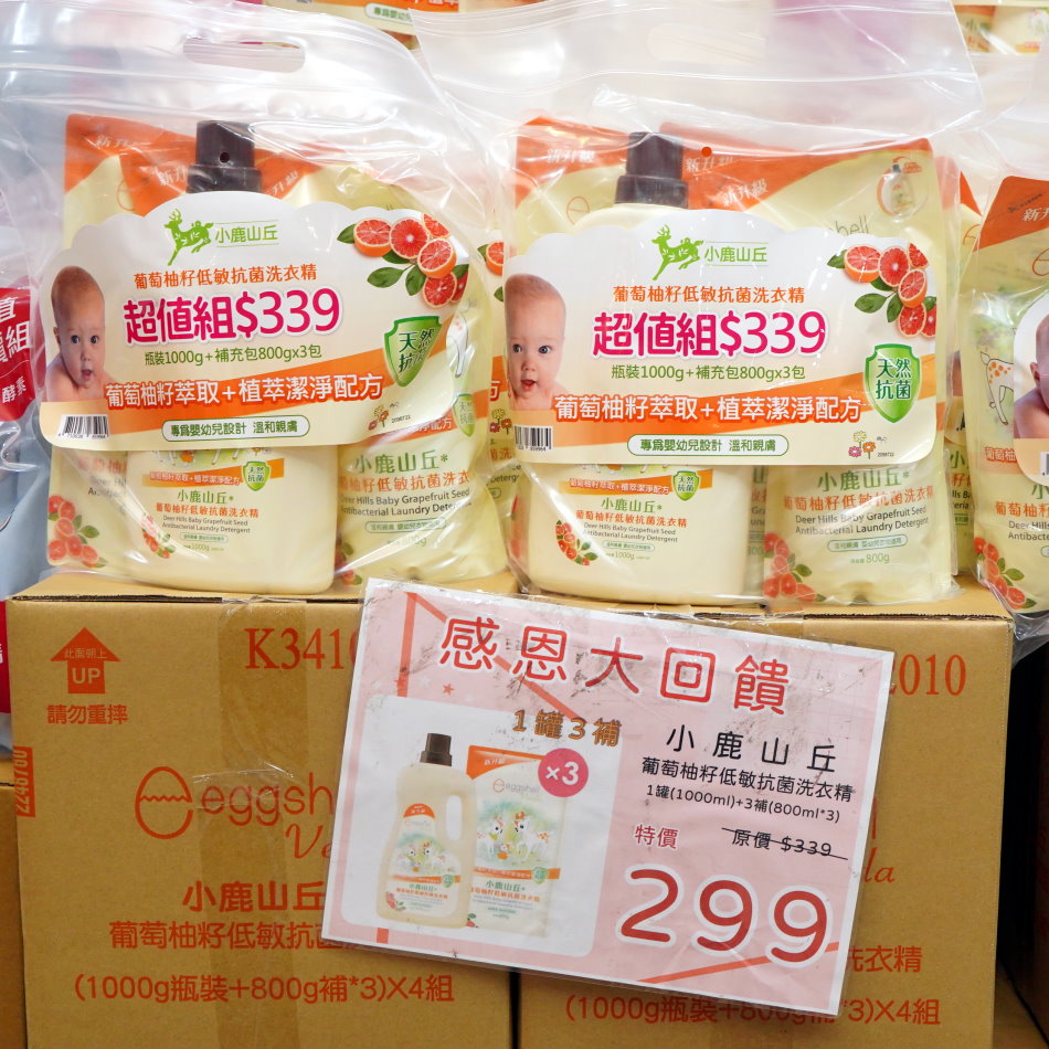 ▼小鹿山丘葡萄柚籽低敏抗菌洗衣精整套只要299元(本場限定),裡頭有瓶裝x1+補充包x3,拿起來非常有重量,原價可是要339元,現買現省超划算。
