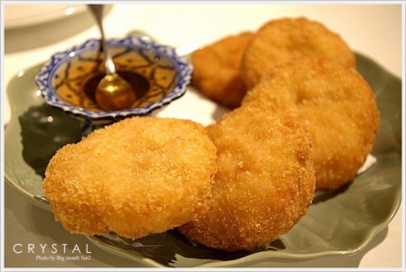 「金錢蝦餅」280元,渾圓飽滿的外觀看了很讓人心動,炸得外皮酥脆,內餡部份和月亮蝦餅類似,