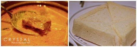 嚐起來香味濃郁,旁邊還附有可以解膩的小菜,奇妙的是這道菜也附了沾了醬料的吐司?
