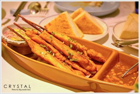 「沙嗲雞」280元,散發著多種香料味的肉串,搭配上充滿花生味的沙嗲沾醬,