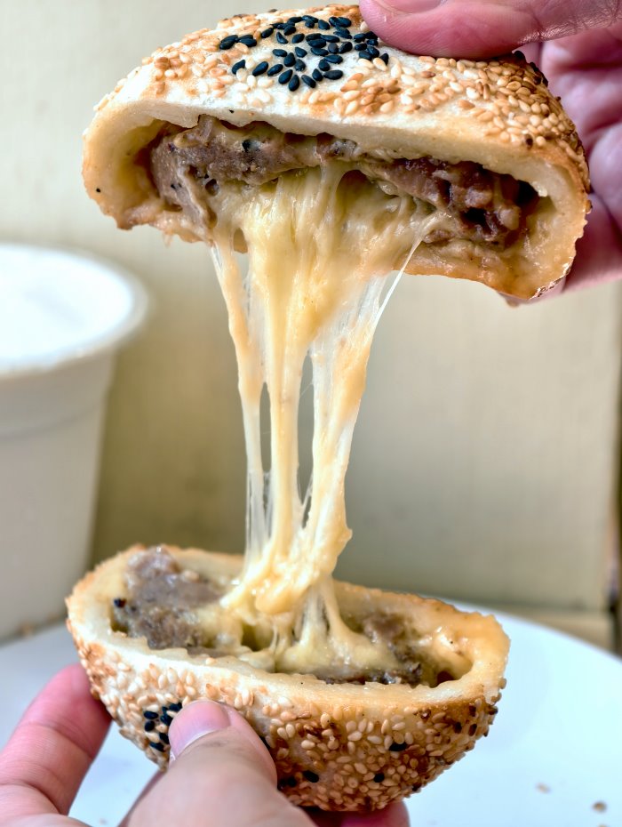 ▼如果不喜歡濃重胡椒味或是加青蔥的朋友,可以選擇口味較為溫和的起司胡椒餅,這款起司牛胡椒餅不僅帶有牛肉鮮甜香氣,搭配香濃的起司口感超豐富,既有豐沛肉汁又有邪惡的牽絲,吃起來大呼過癮。