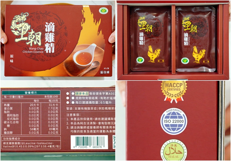 ▼王朝滴雞精外盒以大紅色系為主軸,上頭有設計提把,很適合直接拎去送禮;這款滴雞精除了獲得健康食品認證之外,還有清真認證,製作工廠也有經過合格檢驗,飲用起來更為安心。