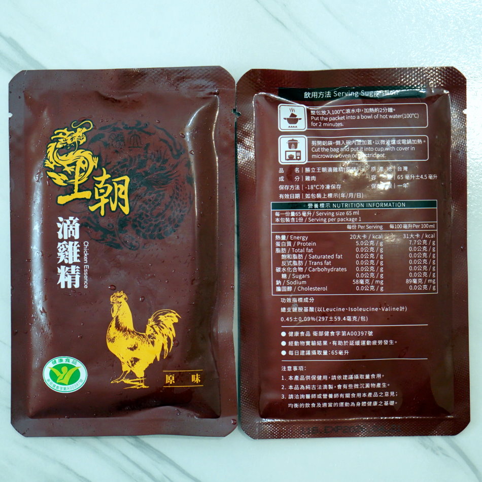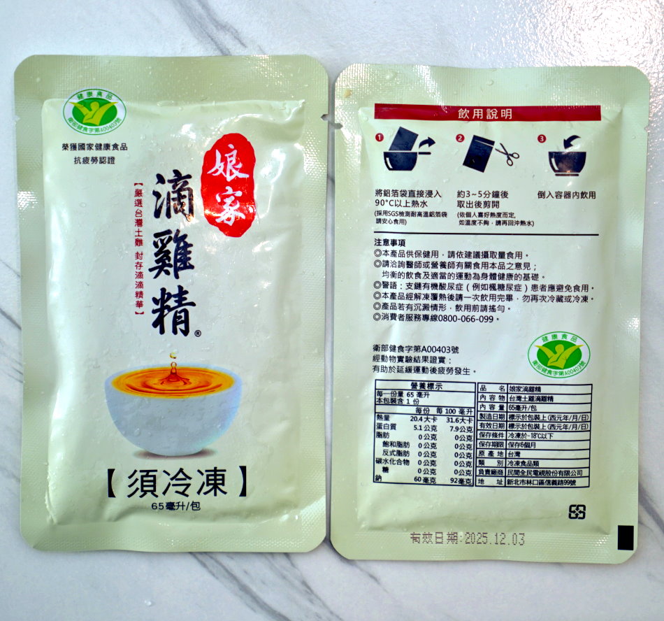 ▼田原香原味滴雞精採用純白色系為底,搭配漸層的色格營造出簡約又現代風的質感,上頭印有健康食品認證標章,相當清楚明瞭;這款滴雞精採冷凍保存,保存時間僅六過月,需留意飲用時間每包60 ml,加熱方式相較其他品牌來說較為複雜,必須先將鋁袋剪開,倒出結凍的滴雞精,再搭配微波或電鍋加熱。