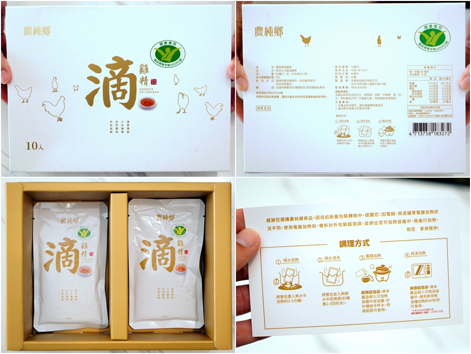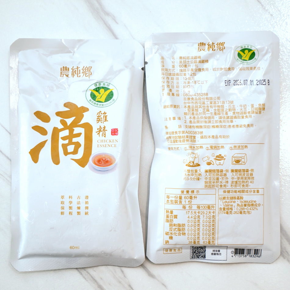 ▼農純鄉滴雞精外盒以純白為底,搭配燙金的字樣與圖示,簡潔的設計相當清爽;上頭印有健康食品標章,背面也有詳細的產品說明,對於檢驗報告有興趣的朋友也可以直接掃描QR Code參考。
