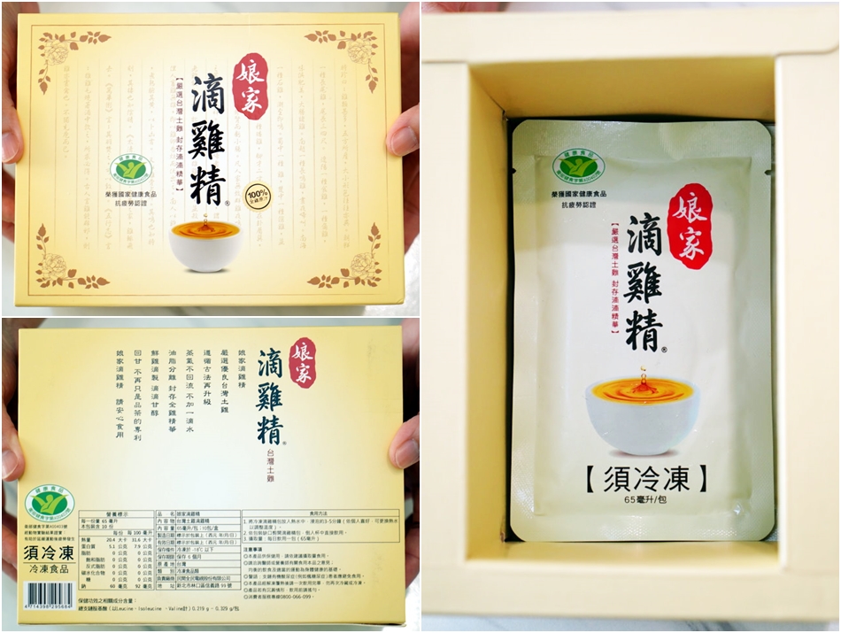 ▼娘家滴雞精外盒採鵝黃色為基底,看起來相當古典,外盒印有健康食品標章,背面也有詳細的產品資訊說明;這款滴雞精採用冷凍保存,保存時間僅六過月,需留意飲用時間,每包65 ml,飲用前隔水加熱再倒出享用即可。