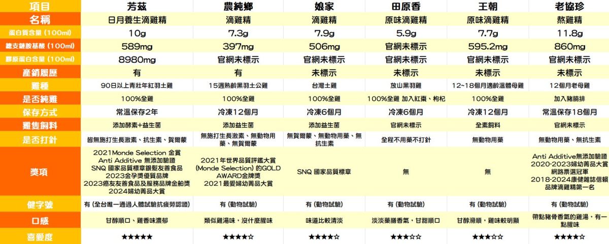 大口覺得滴雞精的口感跟味道其實都大同小異,畢竟每個人口味不同,選自己能夠接受的就好;但大家畢竟都是為了快速補充營養,以調養保健及養生的目的才喝滴雞精的,滴雞精當然要挑選營養數值高的。不過以我們比較在意的關鍵點來綜合評比,心目中的滴雞精綜合排名前三名如下:芳茲>農純鄉>娘家,其中芳茲日月養生滴雞精是目前市售唯一「健字號小綠人+常溫+純雞滴煉」的抗疲勞滴雞精,也是唯一人體實證抗疲勞的滴雞精,對於提神抗疲勞也有一定效果,所以是我們優先選擇芳茲的原因;再來選擇農純鄉是因為他採用黑羽土公雞,營養標示也算是清楚,喝起來也相當順口;娘家則是因為採用台灣土雞,總支鏈胺基酸BCAAs含量也算高,官網標示也很詳細,雖然味道沒這麼討喜,但喜歡清淡口味的朋友應該比較能接受;老協珍、王朝都是採用老母雞,老協珍由於有添加豬腩排,所以這部分多少也會有影響,口感也比較好一點;最後選擇田原香的原因是因為官網細節較少,這點稍微可惜,不然整體口感我們是滿喜歡的。以上是我們個人的評比心得,提供給大家參考!