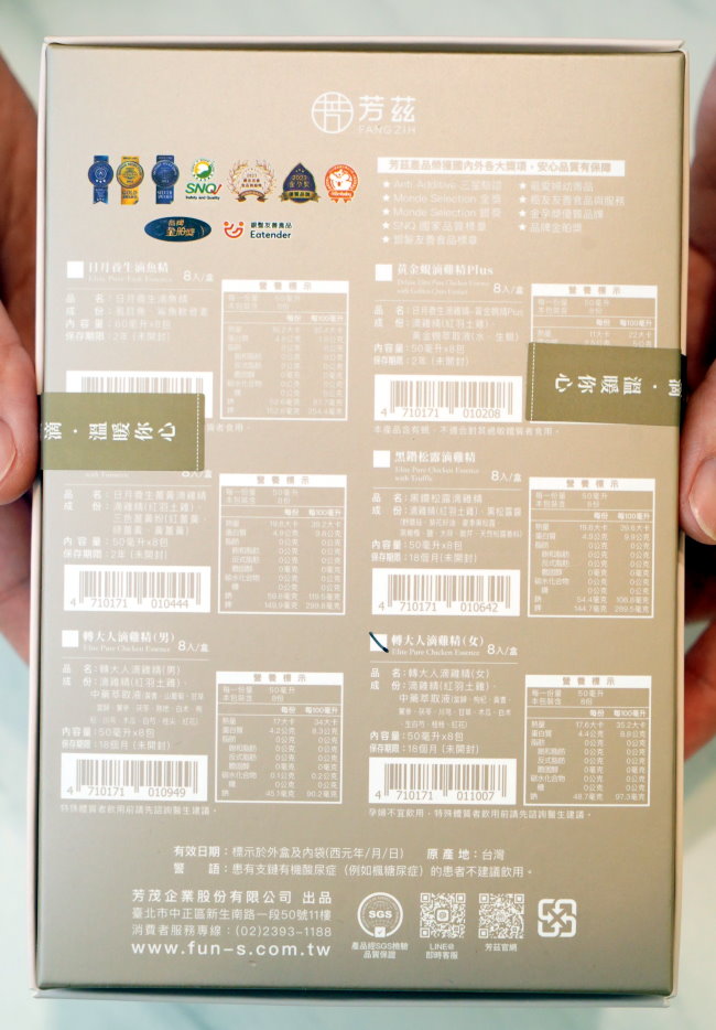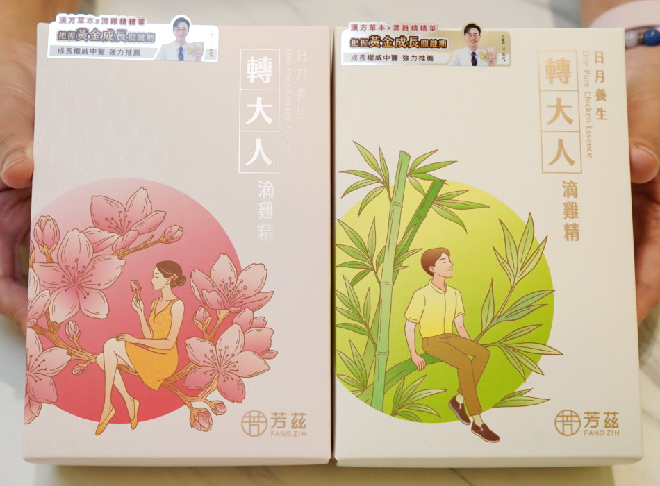▼芳茲轉大人滴雞精(男版、女版)的外盒相當典雅別緻,並以男孩、女孩意象做區分,讓人一目了然;背面有詳細的產品資訊與營養標示,飲用起來更安心。