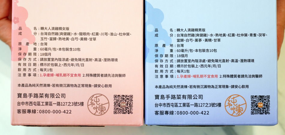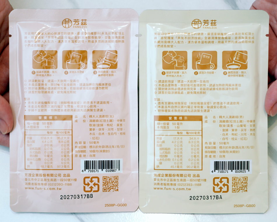 ▼芳茲轉大人滴雞精(男版、女版)延續外盒包裝,以顏色、意象做區分,背面也有詳細的食用方式、注意事項、營養標示、產品資訊、保存日期等,也有提供QR Code掃描了解更多資訊。
