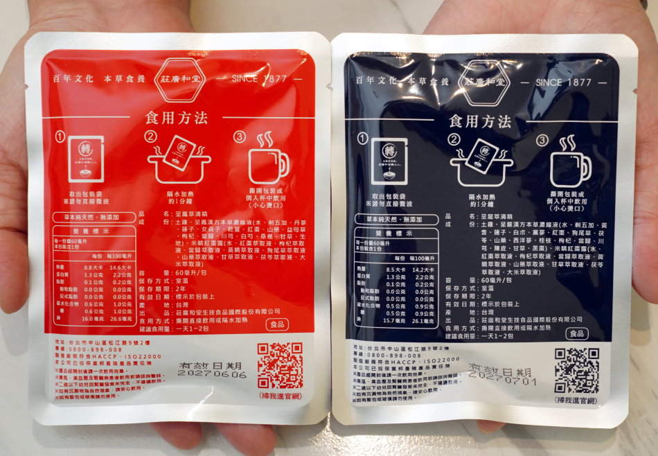 ▼莊廣和堂轉大人(呈龍本草萃滴精、呈鳳本草萃滴精)外盒是以顏色做區分,紅色為女生呈鳳配方,藍色為男生呈龍配方,盒側有簡單介紹及QR Code可供掃描。