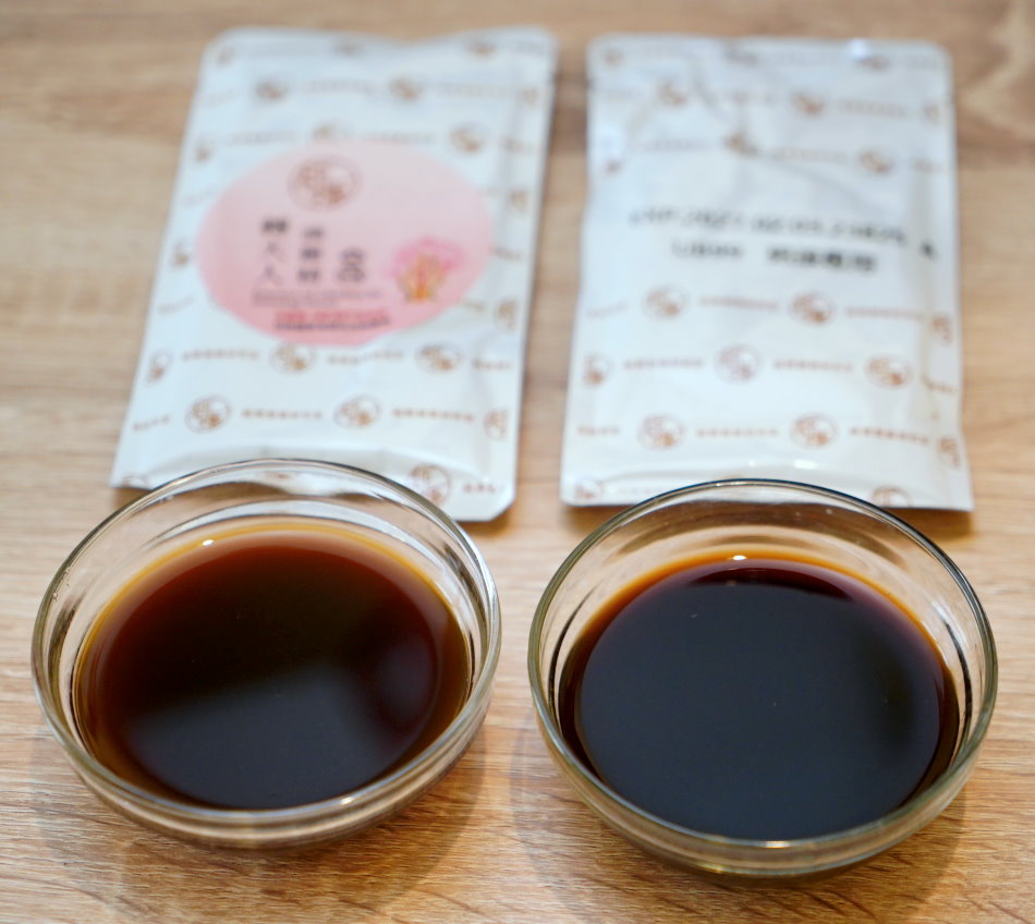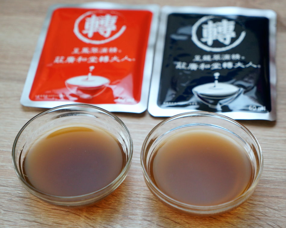 ▼呈鳳配方色澤為深褐色,呈龍配方顏色較接近深咖啡色,兩種喝起來都沒什麼雞味,多了一個藥膳的苦甘味,味道較稀。