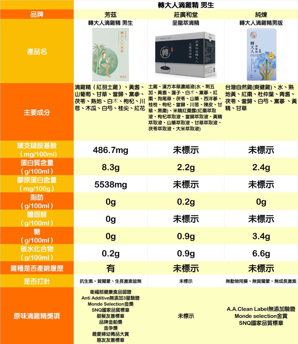 ☛以口感來說:芳茲轉大人滴雞精(男版、女版)>莊廣和堂轉大人(呈龍本草萃滴精、呈鳳本草萃滴精)>純煉轉大人滴雞精(男版、女版)