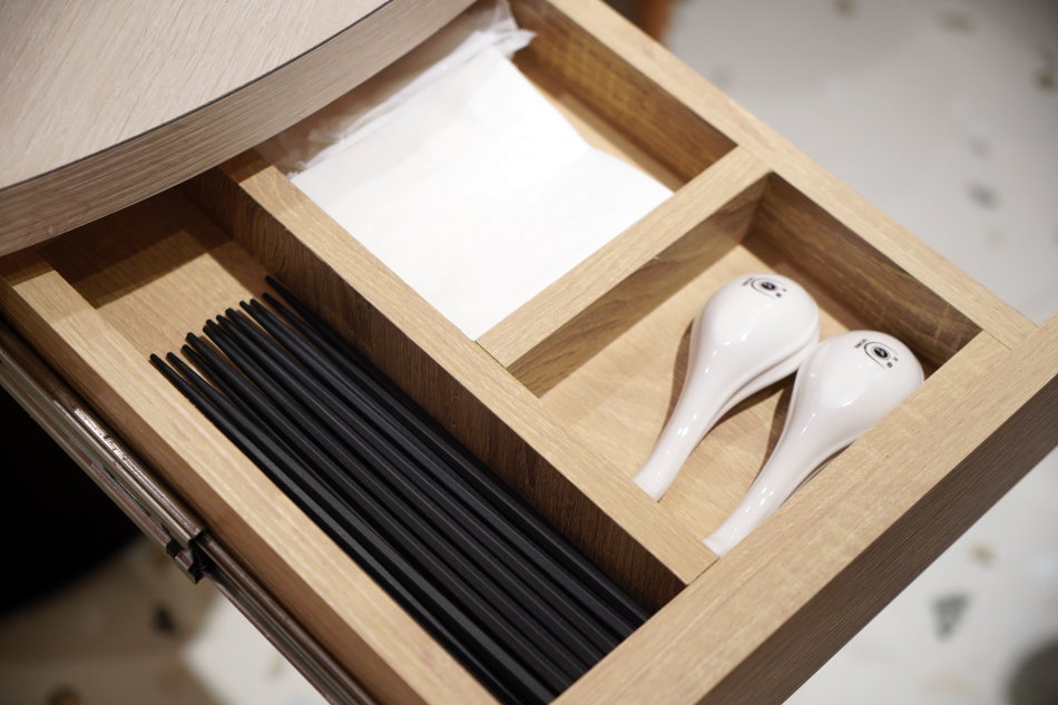 ▼桌上備有碗盤、水杯,筷子、湯匙、衛生紙、濕紙巾則是置於抽屜內,方便拿取又不佔空間。