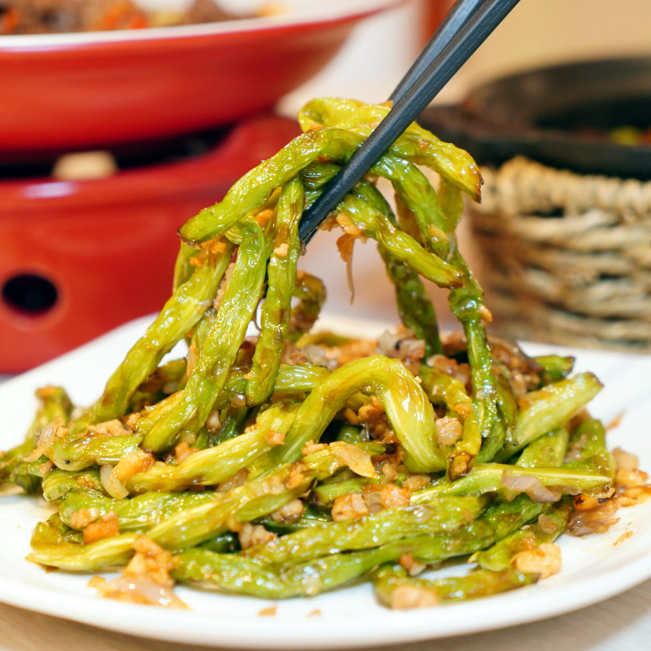 ▼乾煸四季豆,這道菜是不辣的版本,不吃辣的朋友也能多一個選擇,愛吃辣的朋友可以選香煸肉末四季豆,也是非常噴香下飯;吃起來爽脆又帶點微微鹹香,搭配肉末更是層次多元,風味十足。