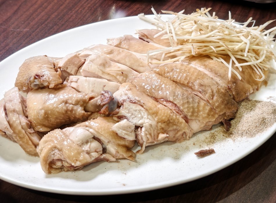 田寮月世界白斬跑山土雞上桌!皮Q肉嫩且帶著迷人的油亮感,旁邊鋪滿新鮮薑絲並附上特製胡椒鹽,完美展現了食材本身的鮮甜與細緻。