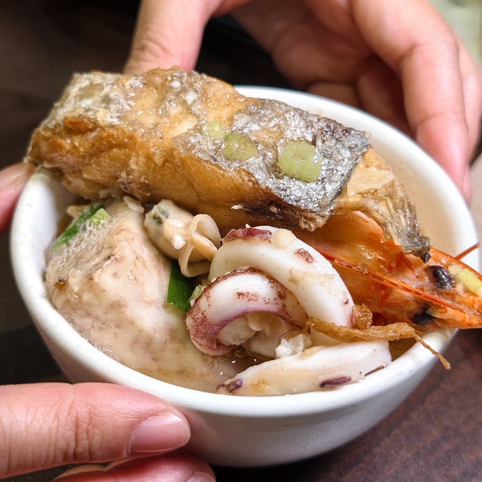這一小碗裡藏著滿滿驚喜,不僅有厚實的白帶魚、鮮蝦、蛤蜊,還有Q彈的小卷與綿密的芋頭,每一種食材都煮得恰到好處,層次感豐富極了。