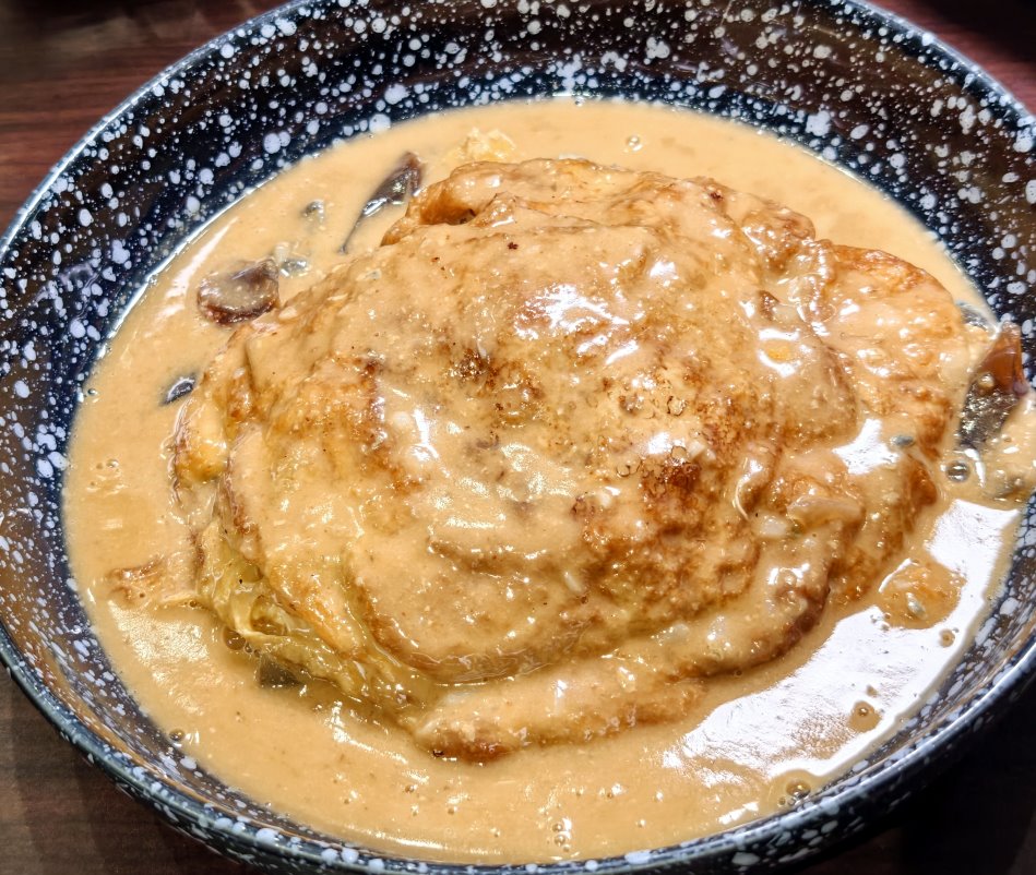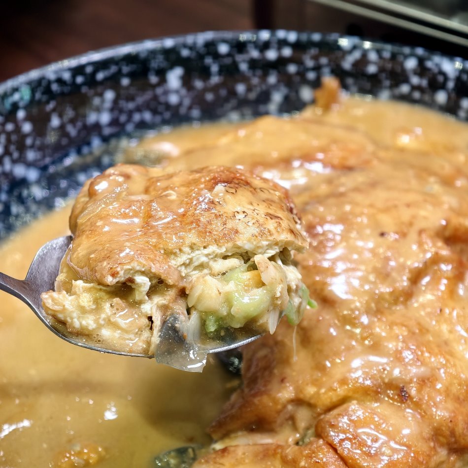 這道金銀蛋時蔬絕對是店內的招牌必點!將鮮嫩的時蔬(這天裡面是絲瓜)與鹹蛋(金蛋)、皮蛋(銀蛋)共同烹煮,湯汁濃郁,兩種蛋的風味與蔬菜的清甜完美融合,層次感豐富。