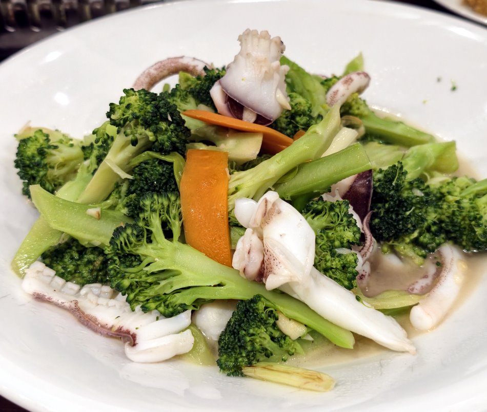 彩蔬燴現釣軟絲, 選用現釣的軟絲,軟絲被切得大塊厚實,Q彈透亮的色澤說明了其新鮮程度。入口後那種鮮脆彈牙的口感,加上彩蔬帶來的自然甜味,每一口都能感受到食材最原始的純粹與美味。