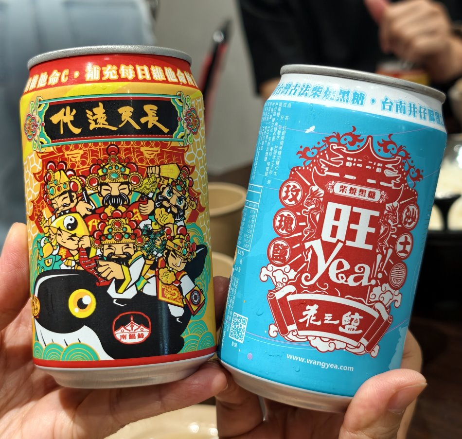 吃台菜手路菜當然要配點特別的在地飲品!左邊是充滿喜氣與神明加持感、含有維他命C的碳酸飲料;右圖則是結合了井仔腳鹽與柴燒黑糖風味的沙士。不僅罐身設計充滿濃濃的台灣文化與潮流感,清爽的口感更是餐後解膩的最佳選擇。