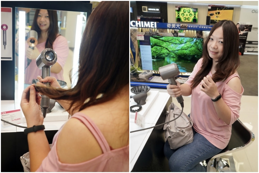 ▼dyson也有自己的美髮專區,不僅有吹風機、捲髮造型器等,還有配件的展示,最厲害的是可以直接坐在鏡子前面試用,旁邊還幫妳打上白燈,感覺就好像來到百貨公司的展間一樣華麗又速西!