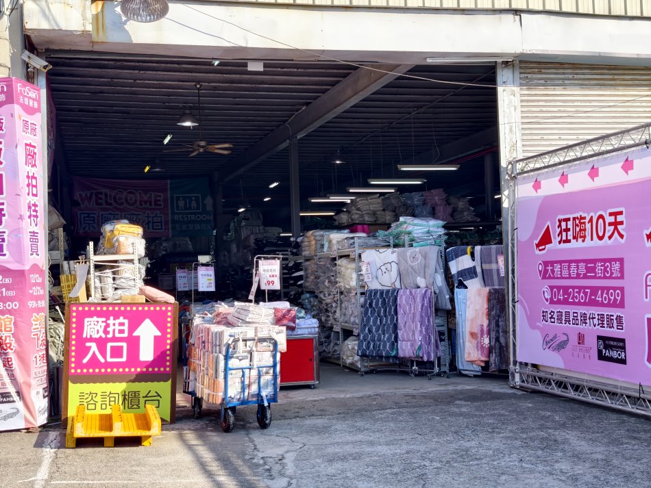 ▼法頌寢具原廠廠拍特賣位於台中市大雅區春亭二街上、三合國小旁,這裡就是法頌寢具的工廠,一年一度的年終清倉特賣就在這裡舉辦,商品更多更精彩,只有短短10天記得來搶便宜!